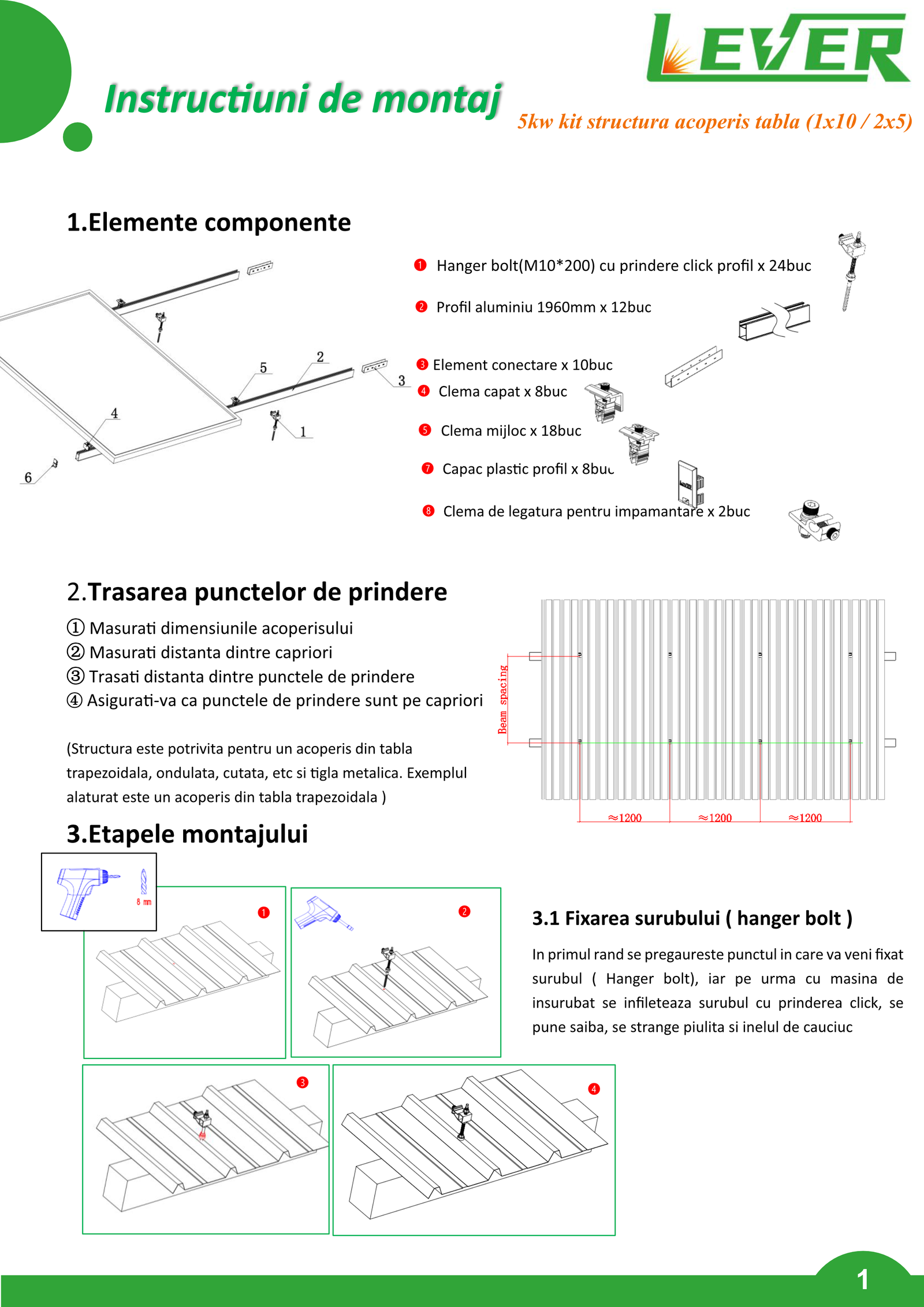 Kit de montaj pentru sisteme fotovoltaice 5kw pe acoperis de tabla contine: