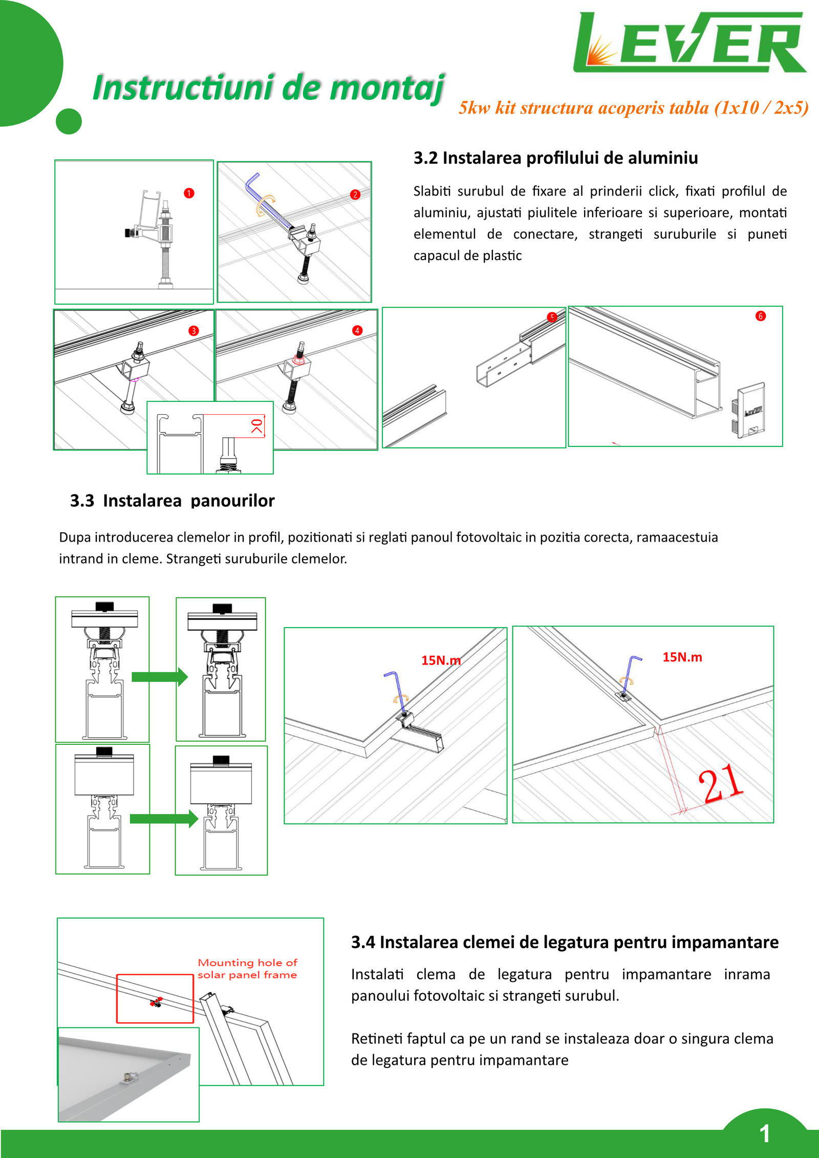 Kit-ul de montaj se poate folosi pentru un aranjament de 1 rand cu 10 panouri sau 2 randuri cu cate 5 panouri fiecare.